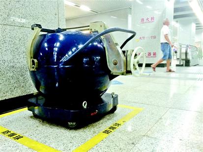 昨日上午11時許,楚天都市報記者在王家灣地鐵站看到,重達750kg的防爆球披著藍色外衣,球體一側寫有醒目的“防爆球”字樣,另一側則安裝了一個可以轉動的方向輪盤,從外形上看,很容易就能分辨出這并不是垃圾桶。除此之外,地鐵站工作人員用黃色警示線將防爆球所在區域單獨分隔開來。